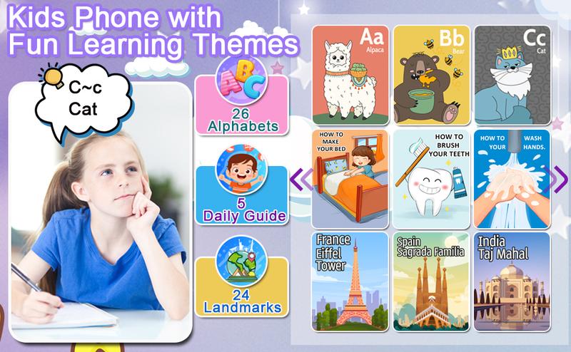 Kids phone has 23 kinds of cute stickers, allowing children to experience the fun of different characters and scenes, satisfying the fun of taking pictures, and leaving interesting memories with family and friends.