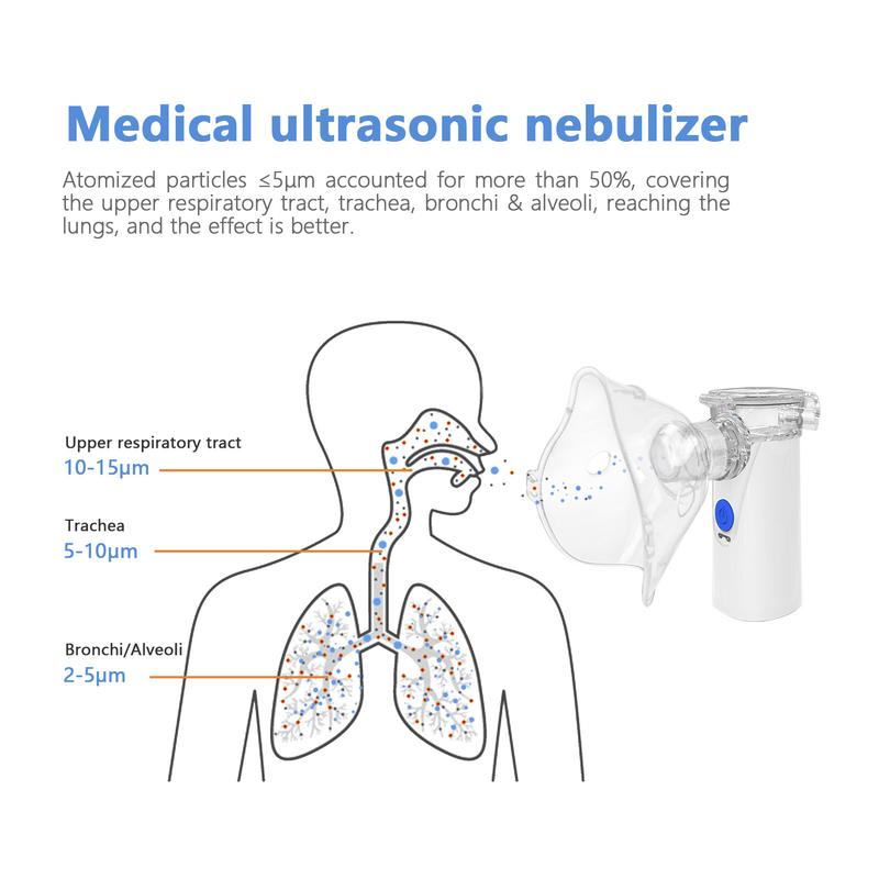 - Portable nebulizer uses ultrasonic directed pressure to atomize liquid into aerosols of small molecules directly into the lungs